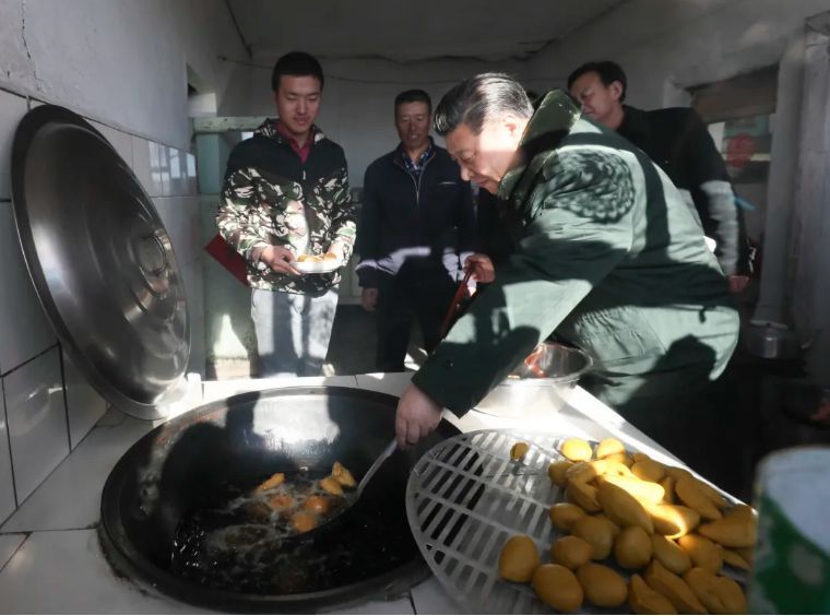 ↑2017年1月24日,習近平在河北張家口市張北縣小二臺鎮(zhèn)德勝村村民徐學海家炸年糕。