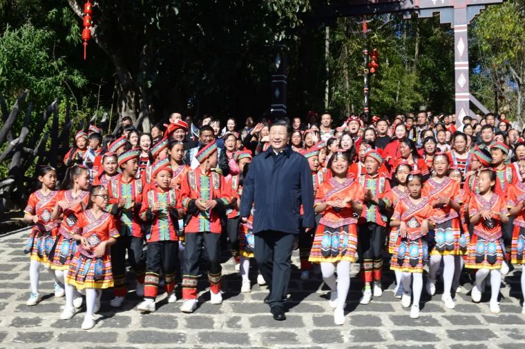 ↑2020年1月19日,云南騰沖市清水鄉(xiāng)三家村中寨司莫拉佤族村的鄉(xiāng)親們唱著《阿佤人民唱新歌》,簇擁著習近平走出村口。