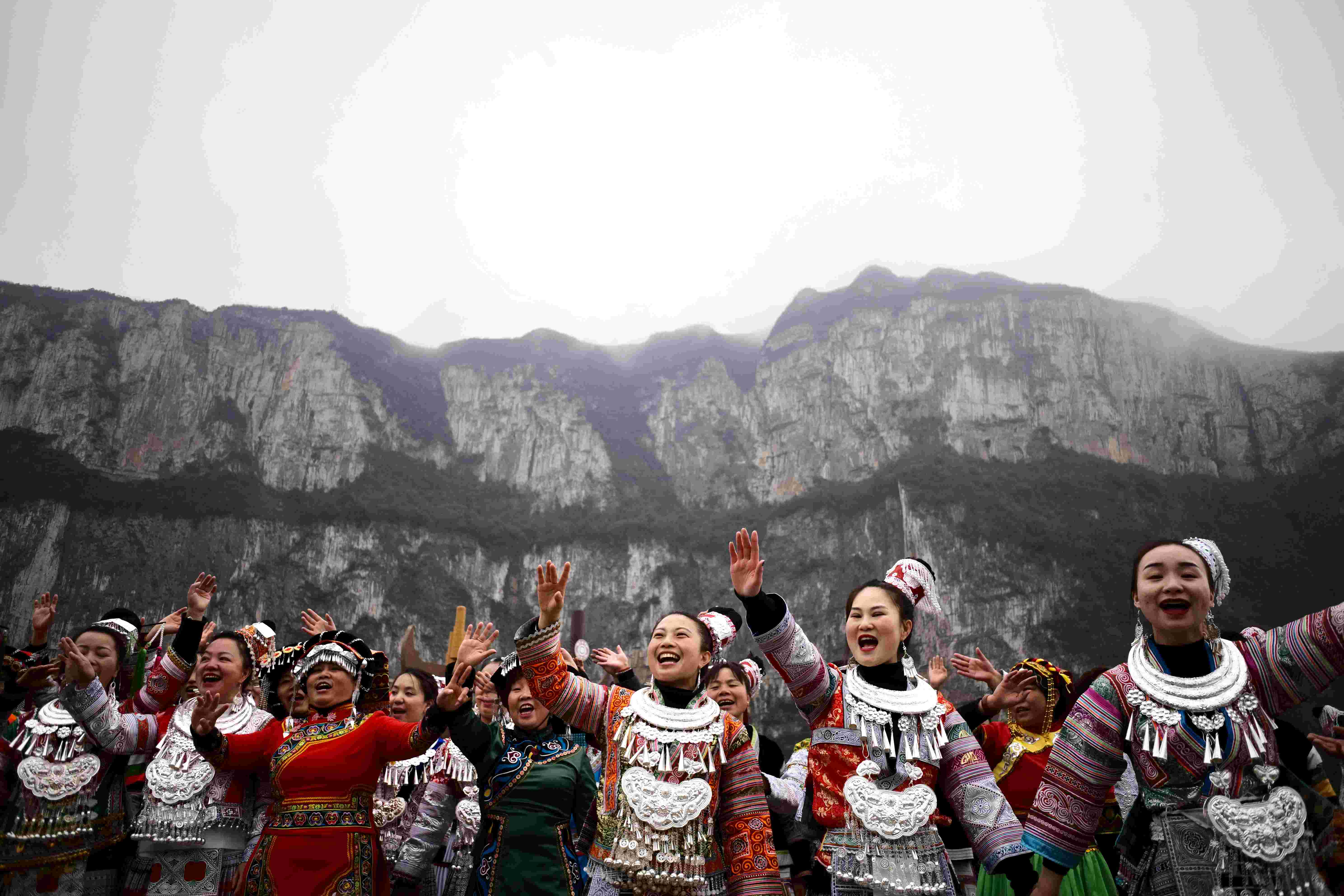 △2021年2月3日,貴州黔西縣化屋村,村民身著苗族服飾歡迎總書(shū)記的到來(lái)。(總臺(tái)央視記者王哈男拍攝)