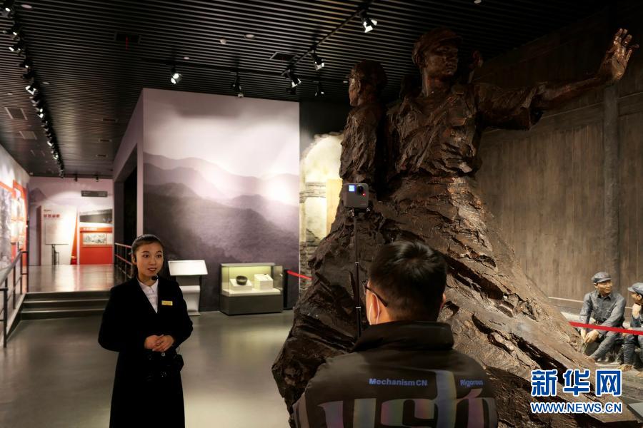 1月26日,在中國(guó)工農(nóng)紅軍第二方面軍長(zhǎng)征出發(fā)地紀(jì)念館,講解員(左)在介紹一尊雕像,雕像中的三位紅軍都是獨(dú)臂,紅二方面軍出了三位“獨(dú)臂開(kāi)國(guó)將軍”——賀炳炎、余秋里、晏福生。新華社記者 蘇曉洲 攝