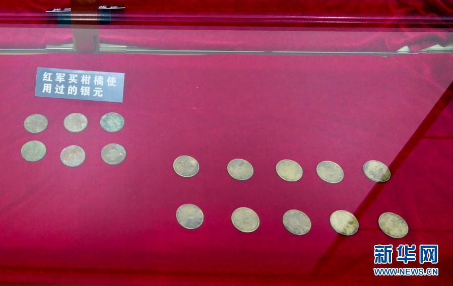 這是1月27日在湖南省張家界湘鄂川黔革命根據(jù)地紀(jì)念館拍攝的銀元,右下角的十枚是當(dāng)年紅軍以高于市價(jià)支付給菜農(nóng)的十塊銀元。新華社記者 蘇曉洲 攝