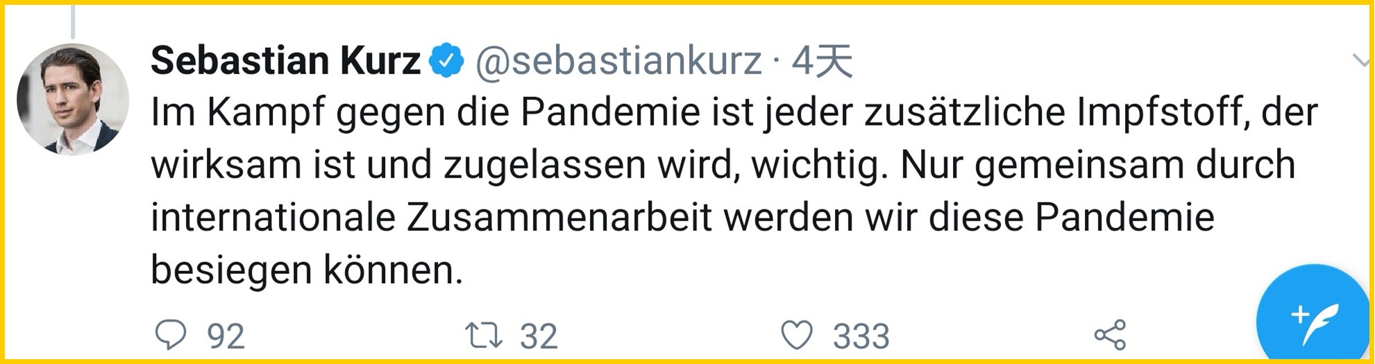 奧地利總理庫爾茨則在社交媒體上連發(fā)兩文。他表示,疫苗審批不應(yīng)有任何地緣政治禁忌。如果中國和俄羅斯的疫苗提交上市申請,歐洲藥品管理局理應(yīng)進(jìn)行審核。