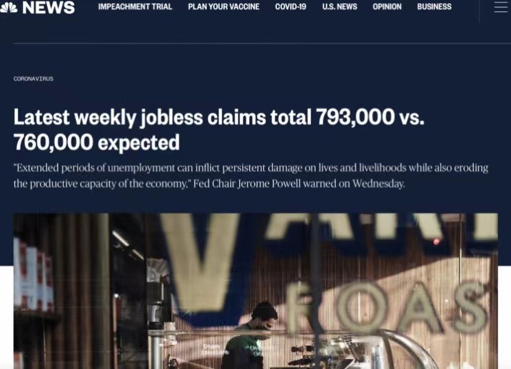 當?shù)貢r間2月11日,美國勞工部公布的數(shù)據(jù)顯示,美國上周首次申請失業(yè)救濟的人數(shù)為79.3萬,多于市場預(yù)期的76萬。分析認為,這表明美國勞動力市場復(fù)蘇還有很長的路要走,也為拜登政府實施大規(guī)模紓困計劃提供了理由。即便如此,新一輪紓困計劃的出臺仍舊困難重重,兩黨對于救助條款的爭議,令許多失業(yè)者的命運懸而未決。