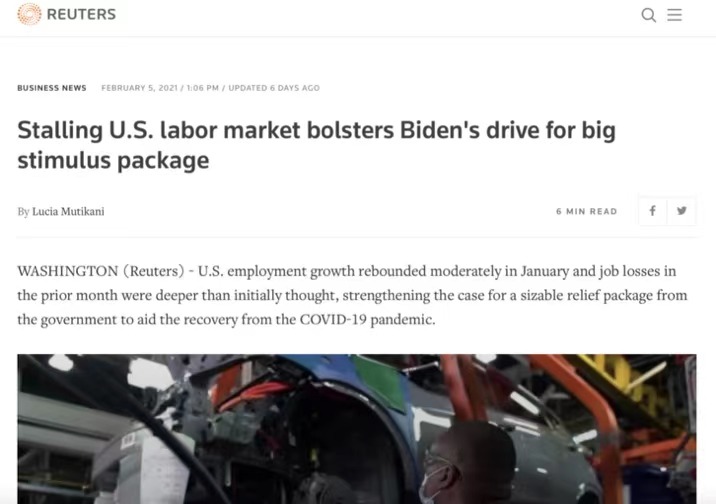 △路透社稱,停滯的美國勞動力市場推動拜登政府大規(guī)模紓困計劃的實施