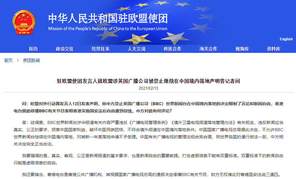 中國駐歐盟使團發(fā)言人就歐盟涉英國廣播公司被禁止繼續(xù)在中國境內(nèi)落地聲明答記者問