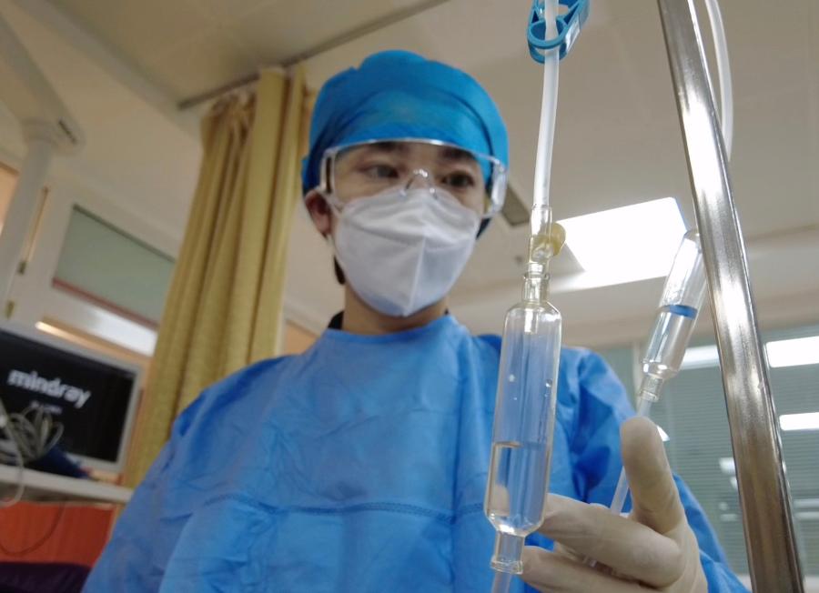 ↑2月11日,沈陽醫(yī)學(xué)院附屬中心醫(yī)院急診科護士邊春雨為患者檢查輸液情況。新華社記者 張逸飛攝