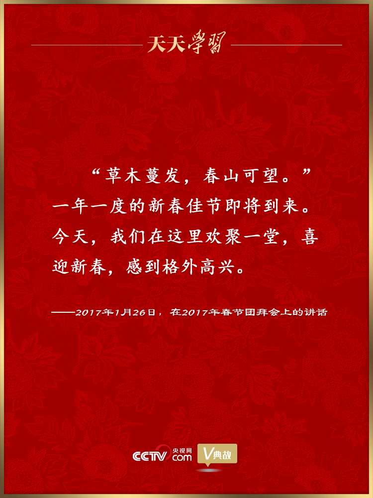 黨的十八大以來,習(xí)近平總書記多次在臘月二十九舉行的春節(jié)團拜會上發(fā)表重要講話,盤點舊歲、謀劃新年,向全國各族人民、港澳臺同胞和海外僑胞拜年,并致以美好的新春祝福。在講話中,習(xí)近平總書記頻頻引用具有新春節(jié)令特點的古代經(jīng)典詩文名句抒發(fā)情懷、暢想未來。這些詩文名句如春風(fēng)化雨潤人心田、暖人心扉,激勵著億萬人民在新的一年里追夢前行。