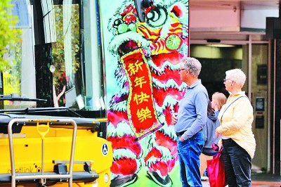 2月6日,在新西蘭惠靈頓市中心的商業(yè)街上,行人從中國藝術(shù)燈箱展中的一處裝置旁走過。 新華社發(fā)