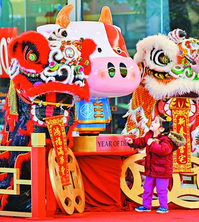 2月11日,一名兒童在加拿大里士滿觀察一處牛年裝飾物。 新華社發(fā)