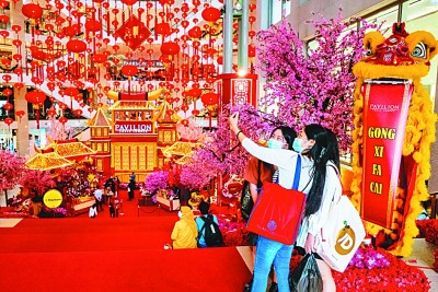 在馬來西亞吉隆坡一家商場,人們戴著口罩在春節(jié)裝飾品旁拍照。 新華社發(fā)