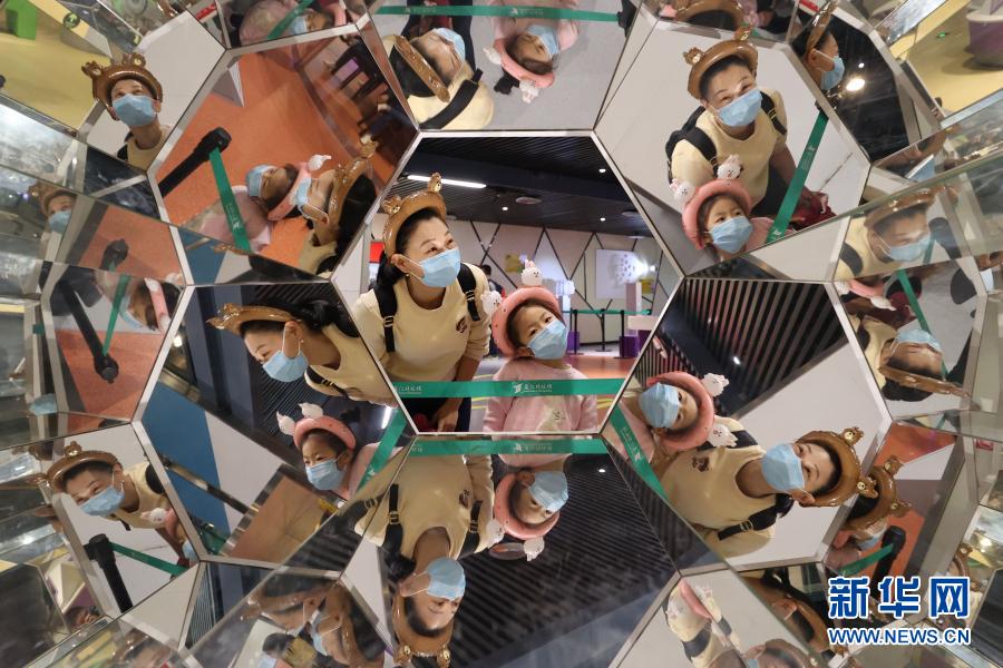 2月16日,小朋友和家長在廈門科技館體驗(yàn)鈍角六面體鏡。新華社發(fā)(曾德猛 攝)