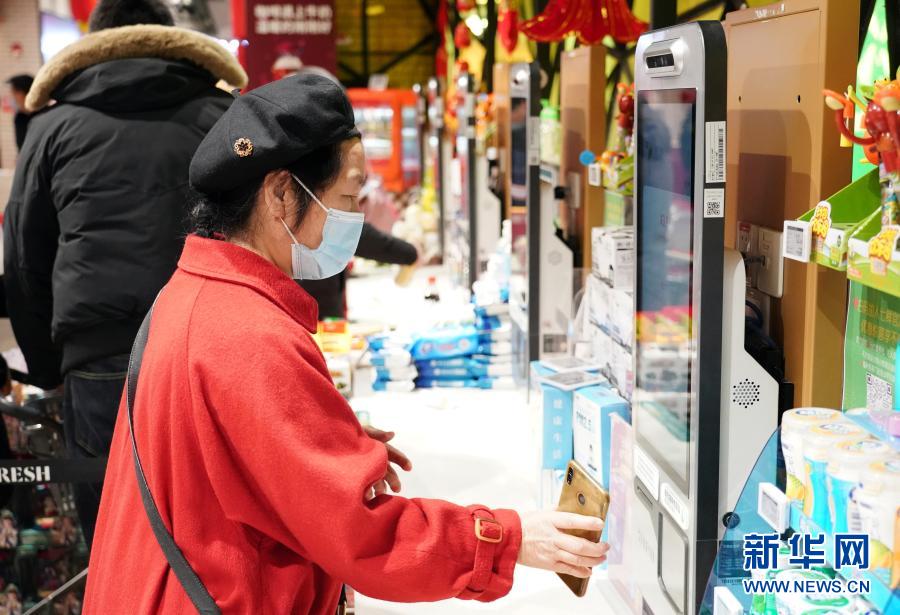 2月15日,在北京市海淀區(qū)的七鮮超市北京華宇店,顧客通過自助收銀機(jī)結(jié)帳。新華社記者 任超 攝