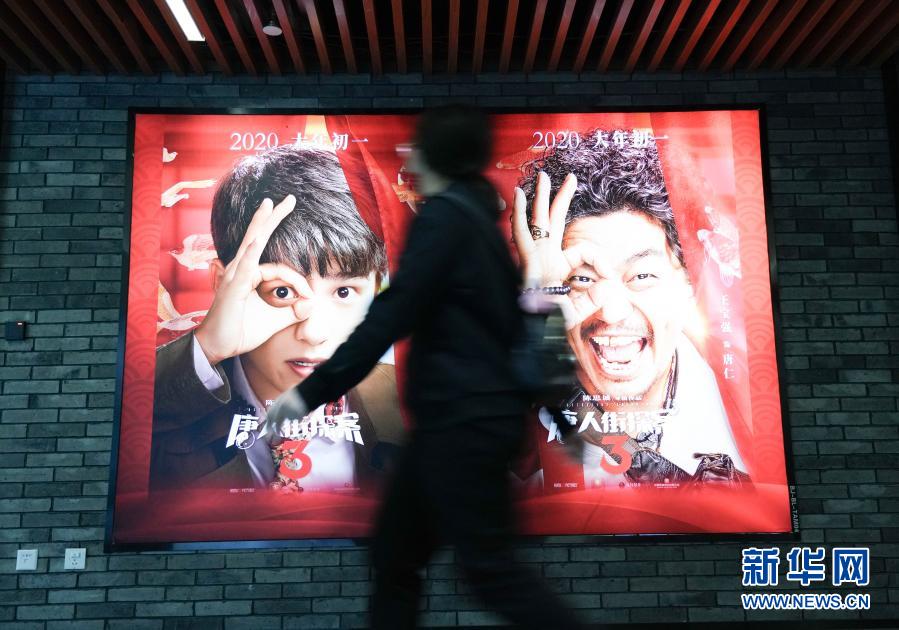 2月17日,在北京前門的保利國際影城,觀眾從《唐人街探案3》海報(bào)前走過。新華社記者 陳鐘昊 攝