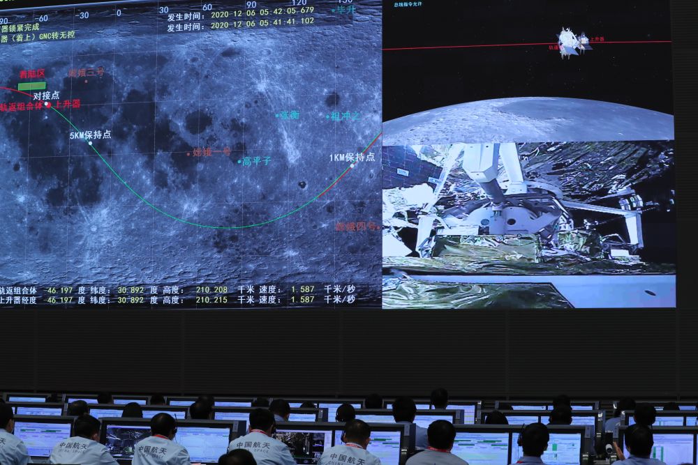 2020年12月6日5時42分,嫦娥五號上升器成功與軌道器返回器組合體交會對接,并于6時12分將月球樣品容器安全轉移至返回器中。這是12月6日,航天科技人員在北京航天飛行控制中心指揮大廳監(jiān)測嫦娥五號上升器與軌道器返回器組合體交會對接情況。新華社記者 金立旺 攝