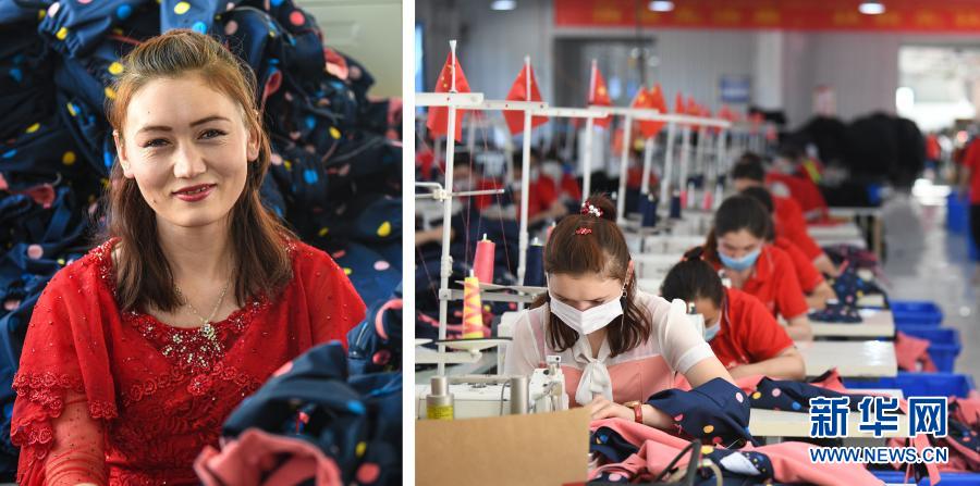 這是一張拼版照片。左圖:2020年5月23日,在新疆喀什地區(qū)莎車縣烏達(dá)力克鎮(zhèn)博依拉村,茹仙古麗·吾斯曼在當(dāng)?shù)亻_(kāi)辦的服裝加工廠工作;右圖:2020年5月21日,茹仙古麗·吾斯曼(前)和同事在服裝加工廠工作。這家服裝加工企業(yè)吸納了當(dāng)?shù)?00余名勞動(dòng)力,大多是貧困戶,與茹仙古麗一樣,這些農(nóng)民走進(jìn)加工廠,變身為產(chǎn)業(yè)工人,生活越來(lái)越幸福。