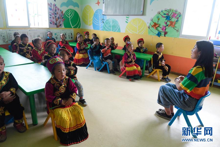 在四川省雷波縣莫紅鄉(xiāng)三峽新村幼兒園,老師教孩子們用普通話(huà)唱歌(2019年5月14日攝)。新華社記者 江宏景 攝