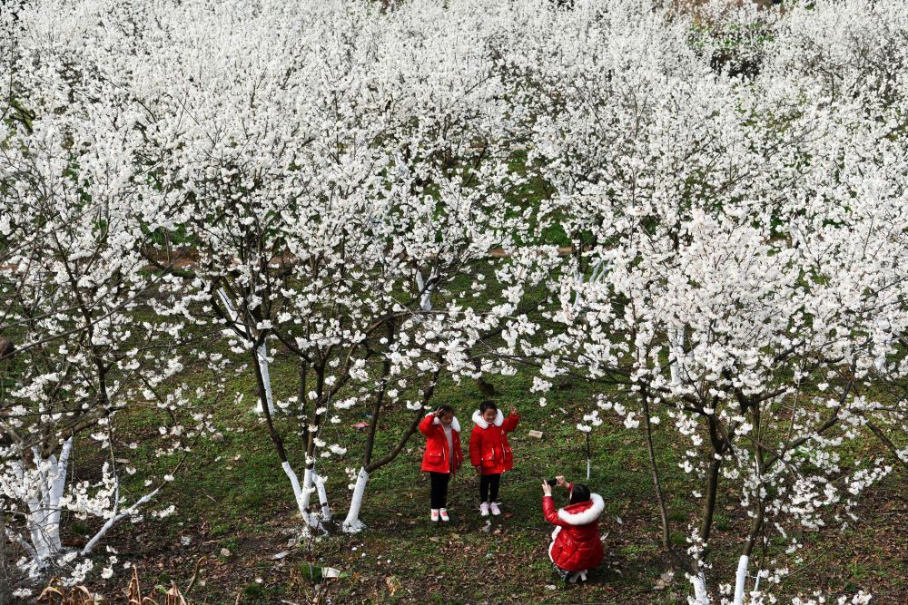 游客在貴州省黔西縣新仁苗族鄉(xiāng)化屋村的櫻桃樹下留影(2月19日攝)。新華社記者 楊文斌 攝
