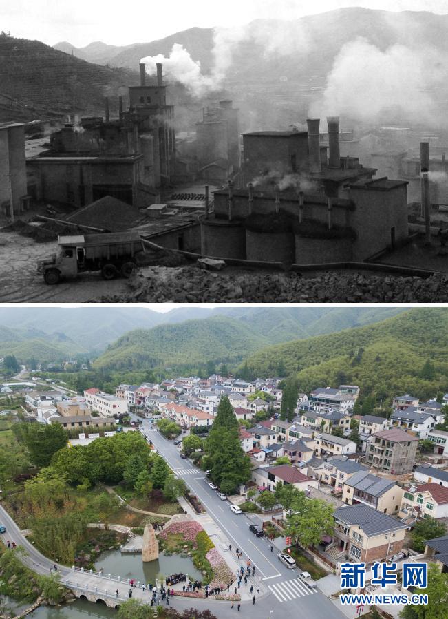 拼版照片:上圖為浙江省湖州市安吉縣天荒坪鎮(zhèn)余村上世紀(jì)八十年代的資料照片;下圖為2018年4月24日,游客在整修一新的余村游覽拍照(新華社記者翁忻旸攝)。