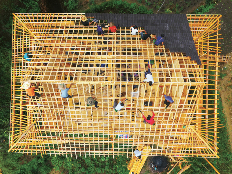 全面小康大家一起走。廣東廉江市和廣西融水苗族自治縣自2017年9月結(jié)成對子,開展“攜手奔小康”幫扶工作,針對山區(qū)群眾建房材料運輸成本高等實際困難,加大對貧困群眾危舊房改造的補助力度,幫助他們實現(xiàn)安居夢。圖為2019年9月3日,在黔桂烏英苗寨,群眾正在幫助貧困戶修建新木樓。 新華社記者 黃孝邦/攝