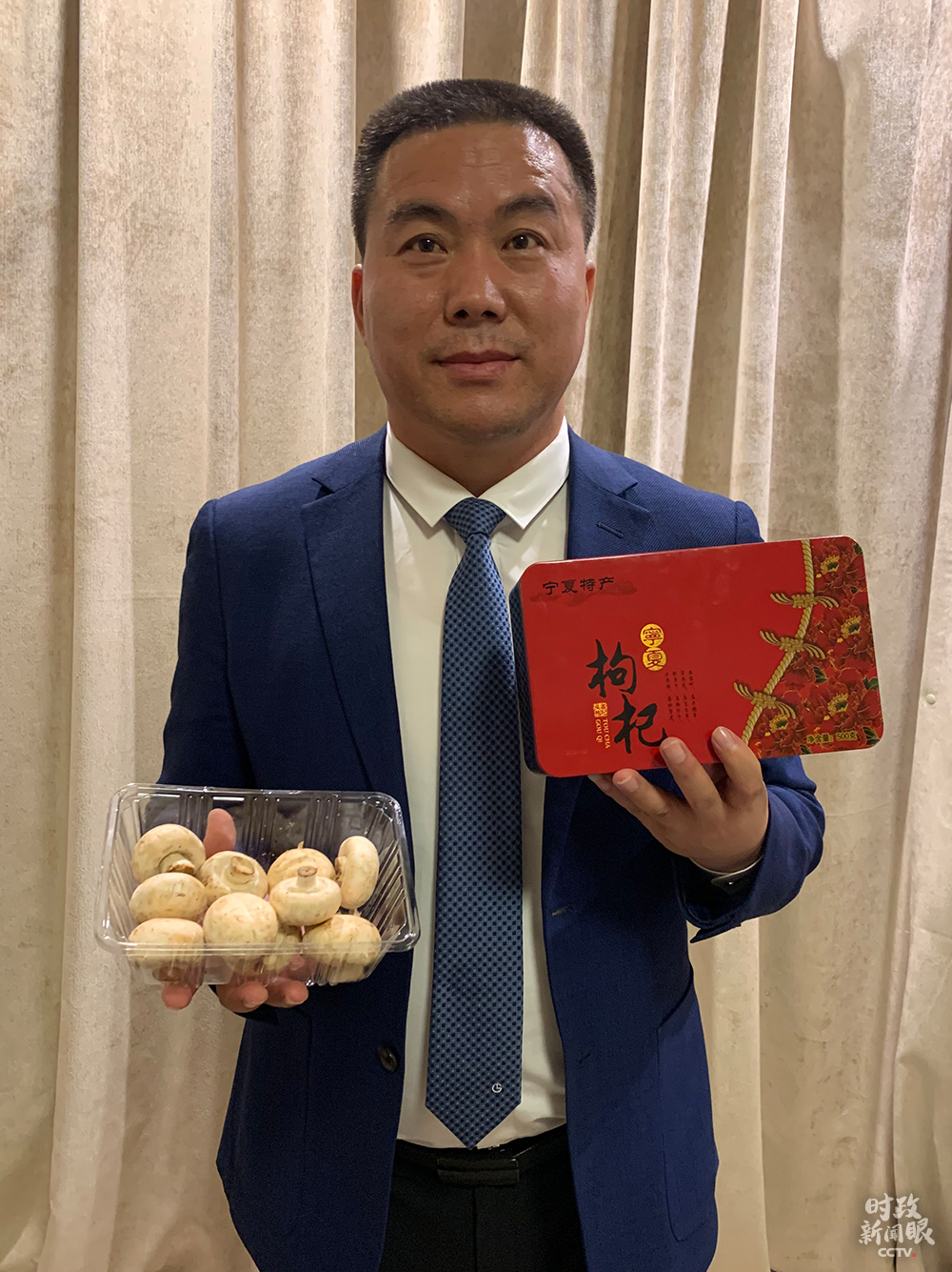 △閩寧鎮(zhèn)黨委書(shū)記張文帶來(lái)家鄉(xiāng)特產(chǎn)蘑菇、枸杞。(總臺(tái)央視記者范一鳴拍攝)