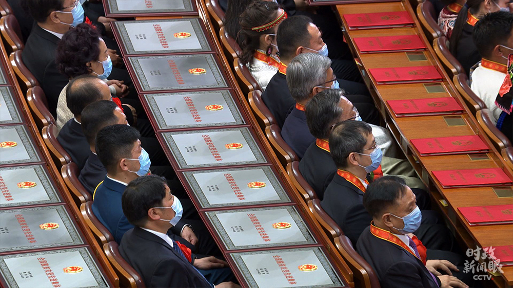 △大會(huì)當(dāng)天,“全國(guó)脫貧攻堅(jiān)楷模”榮譽(yù)稱(chēng)號(hào)獲獎(jiǎng)?wù)叽硎苎谥飨_(tái)就座。(總臺(tái)央視記者鐘鋒拍攝)