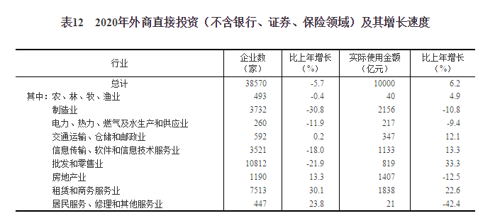 2020年外商直接投資(不含銀行、證券、保險(xiǎn)領(lǐng)域)新設(shè)立企業(yè)38570家,比上年下降5.7%。實(shí)際使用外商直接投資金額10000億元,增長(zhǎng)6.2%,折1444億美元,增長(zhǎng)4.5%。其中“一帶一路”沿線國(guó)家對(duì)華直接投資(含通過部分自由港對(duì)華投資)新設(shè)立企業(yè)4294家,下降23.2%;對(duì)華直接投資金額574億元,下降0.3%,折83億美元,下降1.8%。2020年高技術(shù)產(chǎn)業(yè)實(shí)際使用外資2963億元,增長(zhǎng)11.4%,折428億美元,增長(zhǎng)9.5%。