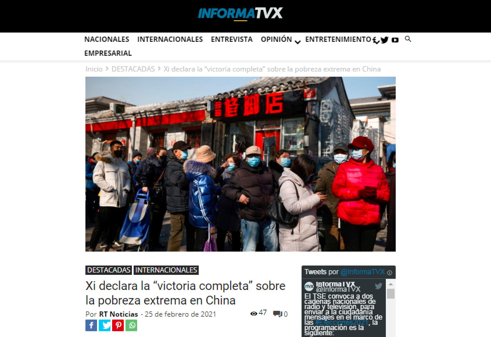 巴西最大媒體環(huán)球集團、旗手傳媒集團、《世界中心報》、《米納斯州報》和《這就是雜志》,阿根廷最大媒體《號角報》集團、《國民報》、《側(cè)影報》,拉美最大的西班牙語門戶網(wǎng)站“布宜諾斯艾利斯消息網(wǎng)”,秘魯《秘魯人報》和《快報》,拉美重要跨國電視新聞網(wǎng)委內(nèi)瑞拉南方電視臺,古巴官方通訊社拉美通訊社,薩爾瓦多TVX電視臺等拉美主流媒體,第一時間報道了中國脫貧攻堅戰(zhàn)取得全面勝利的消息,并紛紛對中國脫貧成就和對世界經(jīng)濟社會發(fā)展發(fā)揮的重要作用予以肯定。