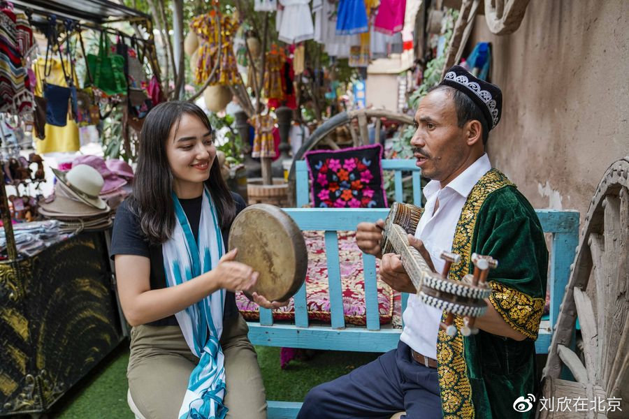 △在喀什古城景區(qū)阿熱亞路“古麗的家”特色庭院里,當(dāng)?shù)鼐用裱葑鄻菲魑慰偷絹恚?019年7月9日攝)。新華社記者 趙戈 攝