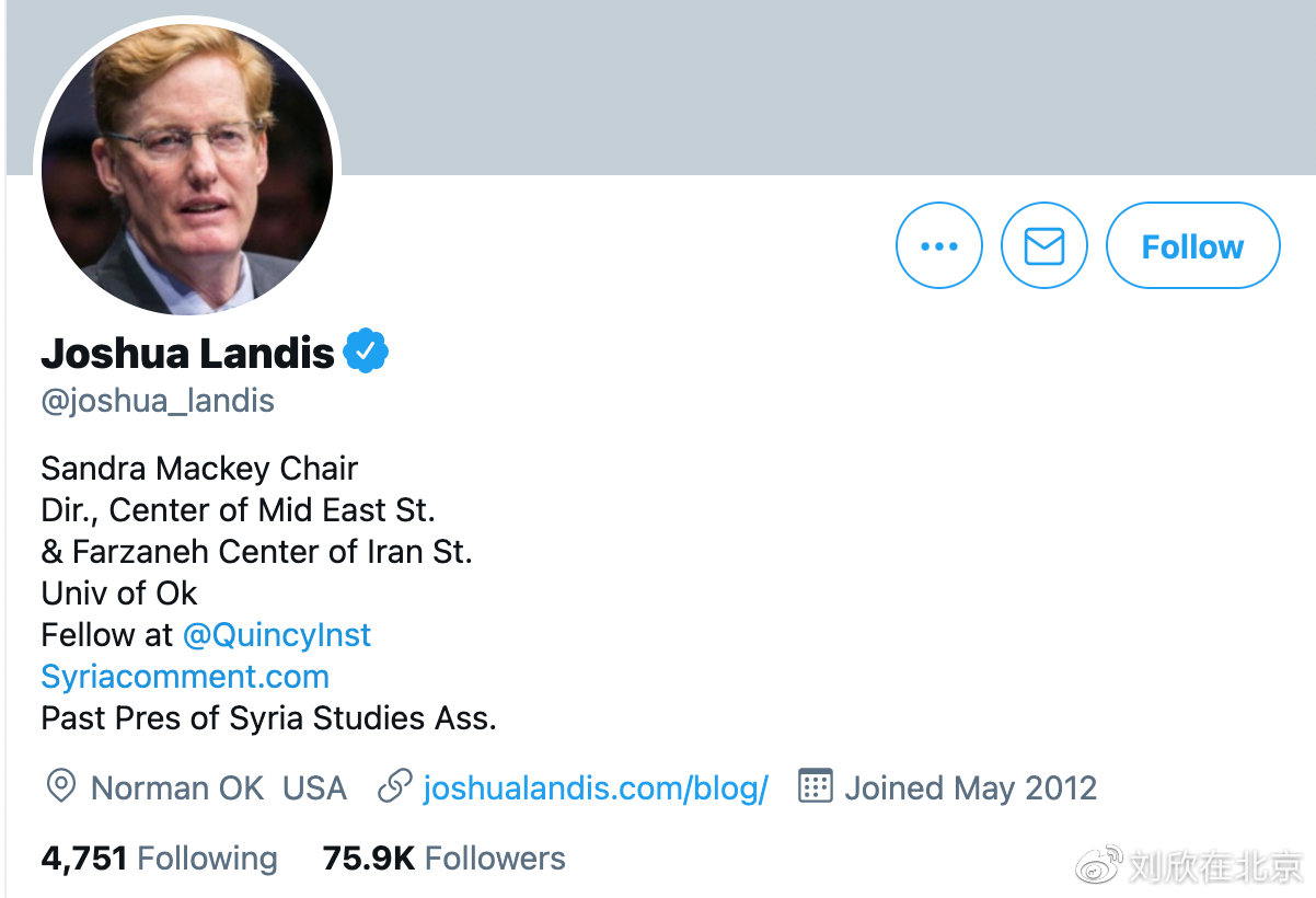 △美國著名敘利亞問題專家約書亞·蘭迪斯的推特賬號(hào)