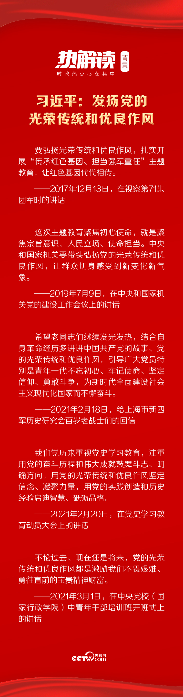 黨的十八大以來,習(xí)近平總書記多次強(qiáng)調(diào)傳承好黨的光榮傳統(tǒng)和優(yōu)良作風(fēng)。前不久,總書記給上海市新四軍歷史研究會(huì)百歲老戰(zhàn)士們回信、出席黨史學(xué)習(xí)教育動(dòng)員大會(huì),再次提及結(jié)合黨史學(xué)習(xí)教育,講好中國共產(chǎn)黨的故事、發(fā)揚(yáng)黨的光榮傳統(tǒng)和優(yōu)良作風(fēng)。