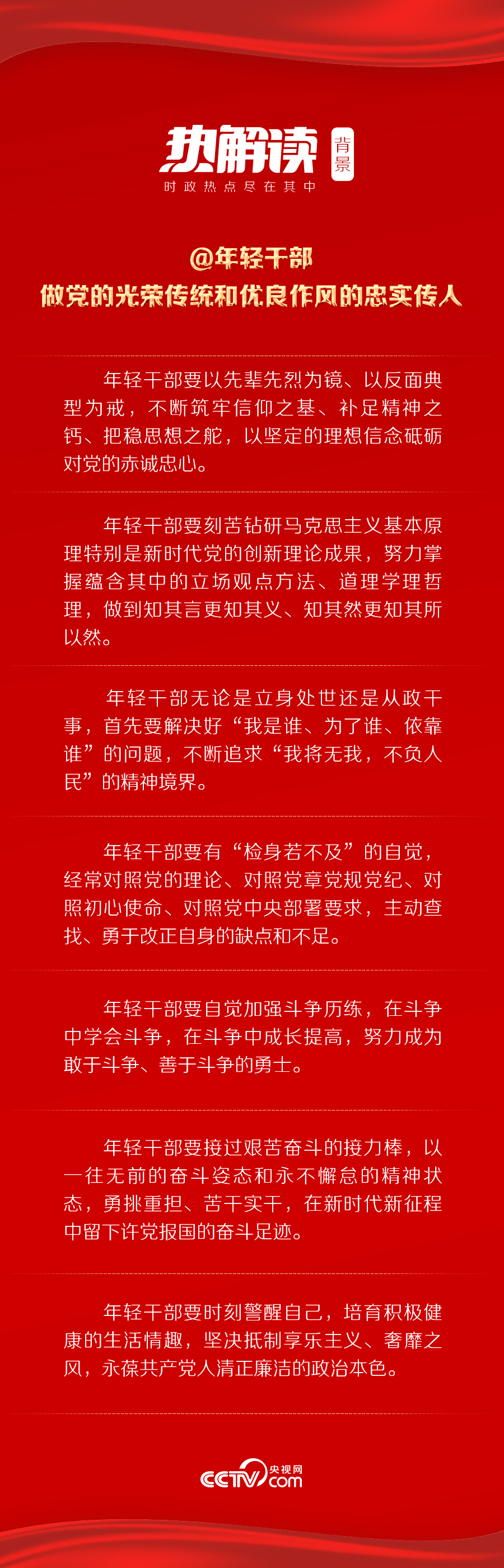 年輕干部是黨和國家事業(yè)接班人,承擔(dān)著新時(shí)代全面建設(shè)社會(huì)主義現(xiàn)代化國家的艱巨任務(wù)?挂咭痪,有他們以生命赴使命的勇毅;脫貧攻堅(jiān)主戰(zhàn)場,有他們“不獲全勝,決不收兵”的決心;中華大地上,有他們只爭朝夕的奮斗身影。