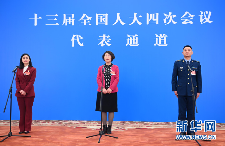 3月5日,第十三屆全國人民代表大會第四次會議舉行首場“代表通道”采訪活動。這是全國人大代表袁晶、郭艷玲、余海龍(從左至右)通過網(wǎng)絡(luò)視頻方式接受采訪。新華社記者 金良快 攝