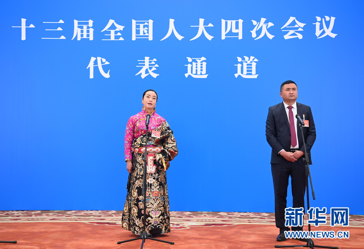 3月5日,第十三屆全國人民代表大會第四次會議舉行首場“代表通道”采訪活動。這是全國人大代表孔慶菊(左)、木沙江·努爾墩通過網(wǎng)絡(luò)視頻方式接受采訪。新華社記者 金良快 攝