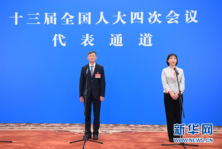 3月5日,第十三屆全國人民代表大會第四次會議舉行首場“代表通道”采訪活動。這是全國人大代表蘇伯民(左)、查艷通過網(wǎng)絡(luò)視頻方式接受采訪。新華社記者 金良快 攝