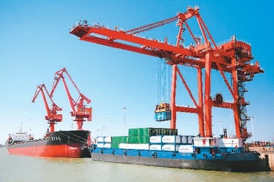 2021年2月20日,江蘇省如皋港蘇中國(guó)際集裝箱碼頭港口機(jī)械正在吊裝物資。