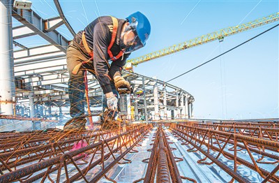 2021年2月20日, 海南省海口國(guó)際免稅城項(xiàng)目工地的建設(shè)者們加緊施工。
