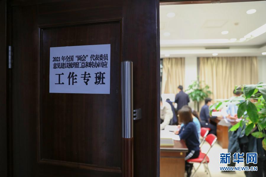 3月5日,2021年全國兩會代表委員意見建議梳理匯總和轉辦回應工作專班的工作人員在忙碌。新華社記者 李木子 攝