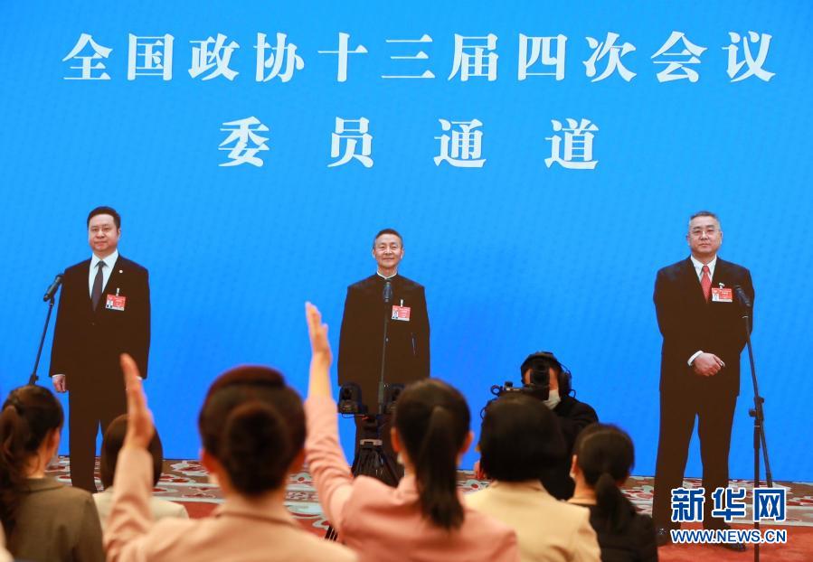 3月10日,全國政協(xié)十三屆四次會議在北京人民大會堂新聞發(fā)布廳舉行第三場“委員通道”采訪活動。這是記者(屏幕中手持話筒者)通過網絡視頻方式提問。新華社記者 王南 攝