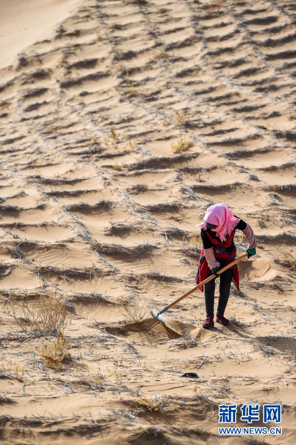 2020年4月2日,工人在阿拉善左旗騰格里沙漠種植花棒。新華社記者 連振 攝