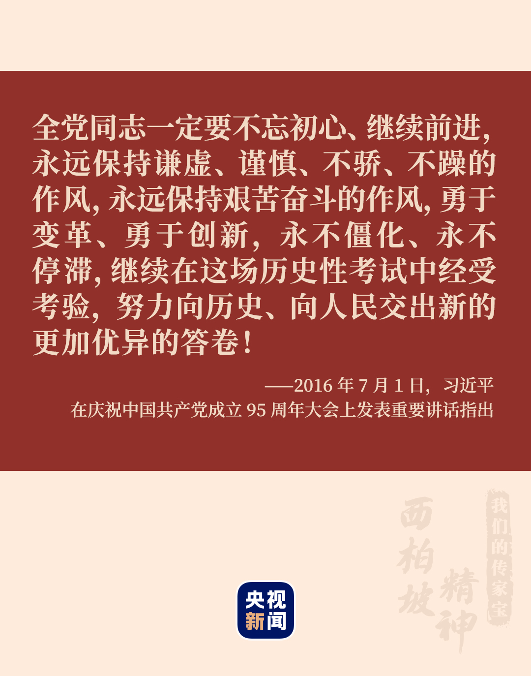 “這場考試還沒有結(jié)束,還在繼續(xù)。今天,我們黨團(tuán)結(jié)帶領(lǐng)人民所做的一切工作,就是這場考試的繼續(xù)。”2016年7月,習(xí)近平總書記在慶祝中國共產(chǎn)黨成立95周年大會上繼續(xù)警醒大家。