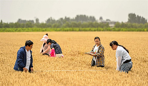 河北省邯鄲市臨漳縣狄邱鄉(xiāng)西狄邱村,農(nóng)業(yè)技術(shù)人員在麥田內(nèi)進(jìn)行小麥測(cè)產(chǎn)。新華社記者 王曉攝