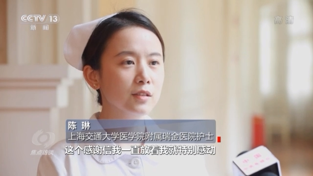 上海交通大學(xué)醫(yī)學(xué)院附屬瑞金醫(yī)院護(hù)士 陳琳:感謝信上面最后他寫道,他說這個(gè)世上沒有救世主,是你們?cè)谌碎g創(chuàng)造奇跡。這個(gè)感謝信里面其實(shí)也描繪了平常我們工作中對(duì)他的點(diǎn)點(diǎn)滴滴的護(hù)理,我們對(duì)他的鼓勵(lì),包括我們對(duì)他的寬慰,平常對(duì)他的治療。這個(gè)感謝信我一直放著,我就特別感動(dòng)。