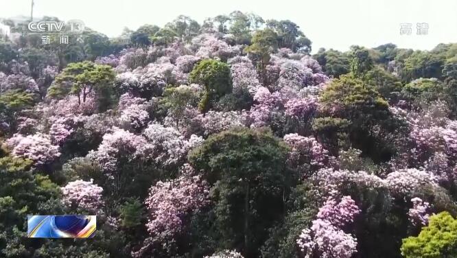 春意盎然的三月,深圳羅湖的梧桐山上的毛棉杜鵑爭相綻放。登高遠(yuǎn)眺,漫山闊葉林成片延伸,粉紅色的花團(tuán)嵌在其間形成花海,春風(fēng)拂過山林,一樹樹毛棉杜鵑也隨之翻涌成浪。