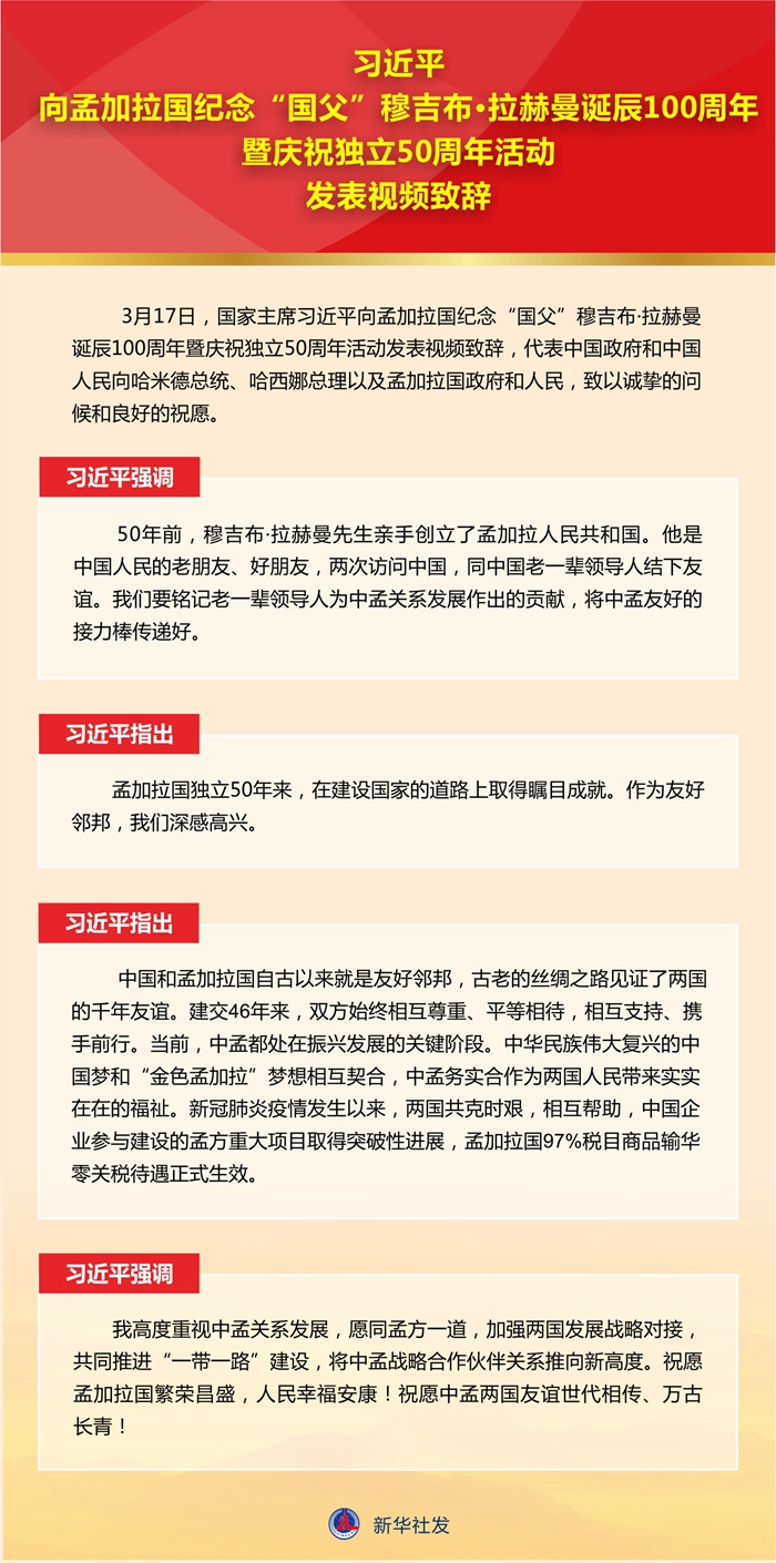 新華社北京3月17日電 3月17日,國(guó)家主席習(xí)近平向孟加拉國(guó)紀(jì)念“國(guó)父”穆吉布·拉赫曼誕辰100周年暨慶祝獨(dú)立50周年活動(dòng)發(fā)表視頻致辭,代表中國(guó)政府和中國(guó)人民向哈米德總統(tǒng)、哈西娜總理以及孟加拉國(guó)政府和人民,致以誠(chéng)摯的問(wèn)候和良好的祝愿。