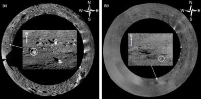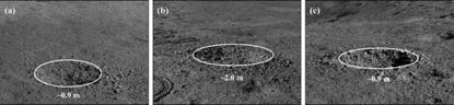 已有研究結(jié)果顯示,位于著陸區(qū)西北方向的織女撞擊坑的一條濺射紋恰好穿過了著陸點附近區(qū)域,而濺射紋內(nèi)常?梢娪蔀R射物形成的二次撞擊坑!坝裢枚枴毖惨晠^(qū)確實還能觀察到若干個內(nèi)部和周邊均存在碎塊狀物質(zhì)的米級和亞米級的新鮮撞擊坑(如下圖所示)。結(jié)合橢圓撞擊坑的長軸方向推斷,這些新鮮撞擊坑應(yīng)當為織女撞擊坑濺射物形成的二次撞擊坑。