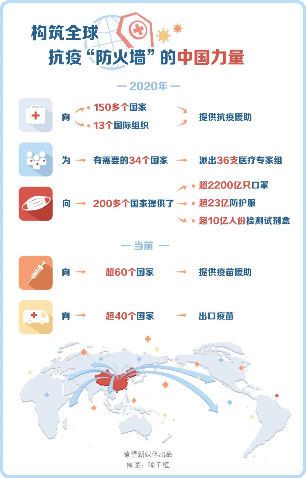世界聽到中國聲音,更見到中國行動。2020年,中國向150多個國家和13個國際組織提供抗疫援助,向有需要的34個國家派出36支醫(yī)療專家組,向200多個國家提供了超過2200億只口罩、23億件防護(hù)服、10億人份檢測試劑盒。當(dāng)前,中國已向超過60個國家提供疫苗援助,向超過40個國家出口疫苗,扎實(shí)履行將疫苗作為全球公共產(chǎn)品的大國承諾。