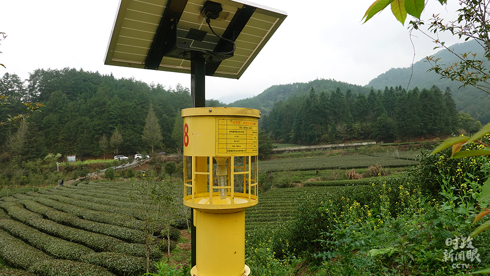 △茶園中的太陽能殺蟲燈,有效減少病蟲害發(fā)生。(總臺央廣記者潘毅拍攝)