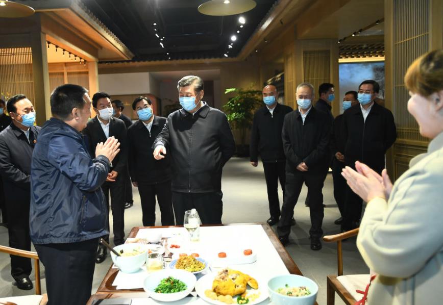 去年4月,習(xí)近平總書(shū)記考察西安大唐不夜城步行街,走進(jìn)老字號(hào)西安飯莊。就餐的顧客、跑堂的店員都簇?fù)磉^(guò)來(lái)。羊肉泡、葫蘆雞、肉夾饃、水盆羊肉、陜西糜子糕……總書(shū)記親切地說(shuō):“這些是家鄉(xiāng)的味道啊!