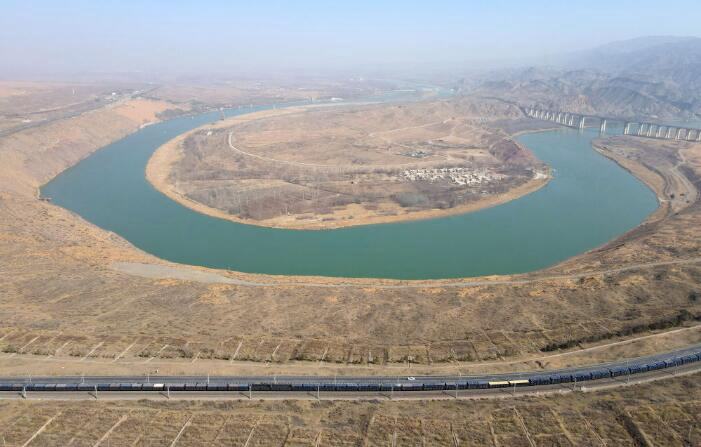 黃河流經(jīng)寧夏中衛(wèi)市沙坡頭區(qū)(3月3日攝,無(wú)人機(jī)照片)。 新華社記者 唐如峰 攝
