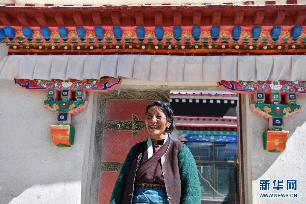 在海拔5373米的西藏浪卡子縣普瑪江塘鄉(xiāng),一名當(dāng)?shù)貗D女站在新建成的邊境小康村“小康房”門前(2020年4月15日攝)。新華社記者 晉美多吉 攝